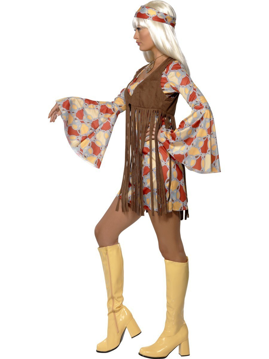 Groovy Baby costume includes a multi-coloured dress and a brown fringe waistcoat. To complete the look a matching headband is also included.