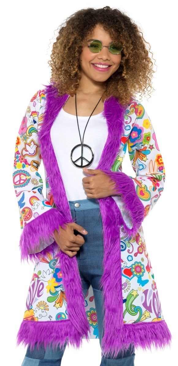 Long 60's Groovy Hippie Coat with a purple faux fur trim.