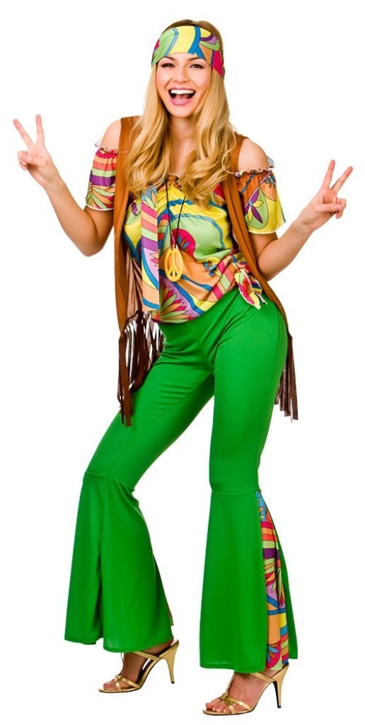 Groovy Hippie costume includes a colourful off the shoulder top and a brown waistcoat. Also included is a pair of green flared trousers with multicolour insert.