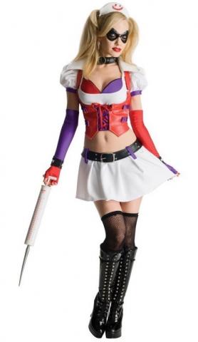 Offically licensed Harley Quinn Arkham City Includes top, skirt, choker, fingerless gloves, belt, headpiece and eye mask. This crazy Gotham look is perfect for a crazy halloween look for when Harley Quinn was disguised as a nurse inside the Arkham Asylum.