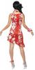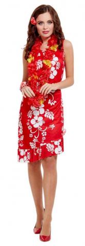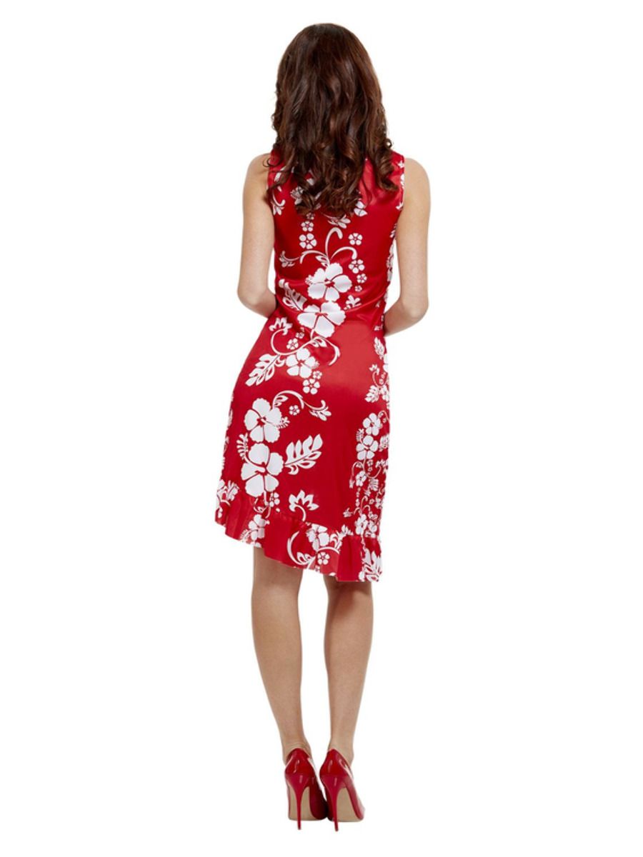 Hawaiian Beauty Costume includes a sleeves red dress with pretty white floral and leaf print, frill detail at the end and an attached flower. Costume also includes floral headpiece and a matching anklet.