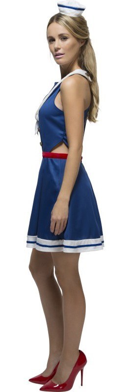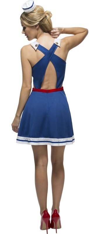 Hey Sailor Costume includes a blue and white cut out dress with an attached underskirt. To complete the look a sailor hat is also included.