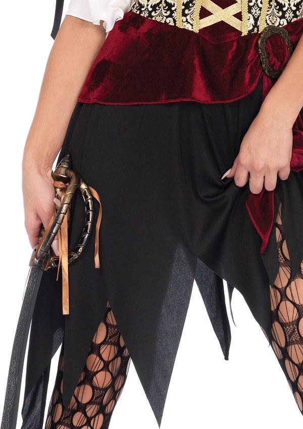 High Seas Wench Costume includes a cold shoulder peasant style dress with a brocade waist and an attached velour waist sash. To complete the look a matching head scarf is also included.