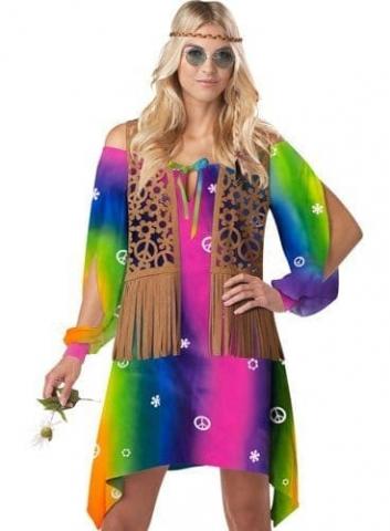 Hippie Chick Multi costume includes a multicoloured bell sleeved dress with low neck line, a fringed vest and matching headband.