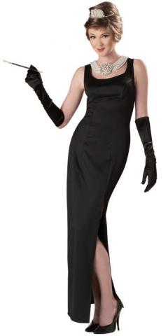 Our fully licensed Holly Golightly Breakfast At Tiffanys costume includes a long black elegant dress with side slit and a pearl necklace with jewels. To complete this iconic look a dazzling tiara is also included.