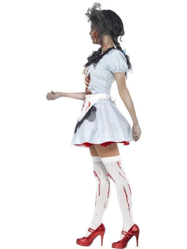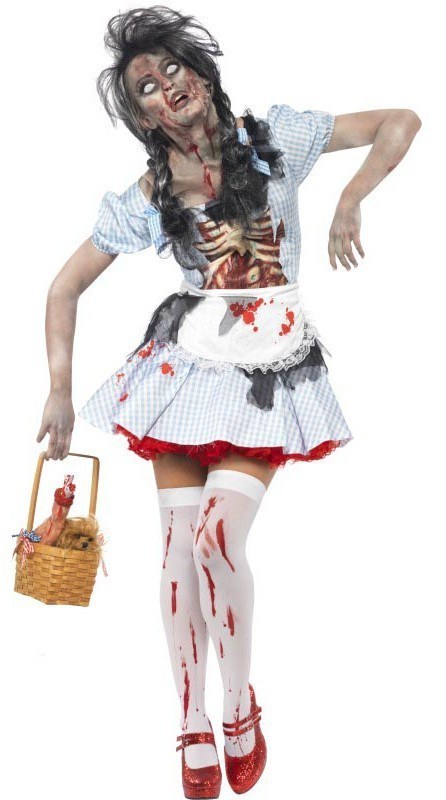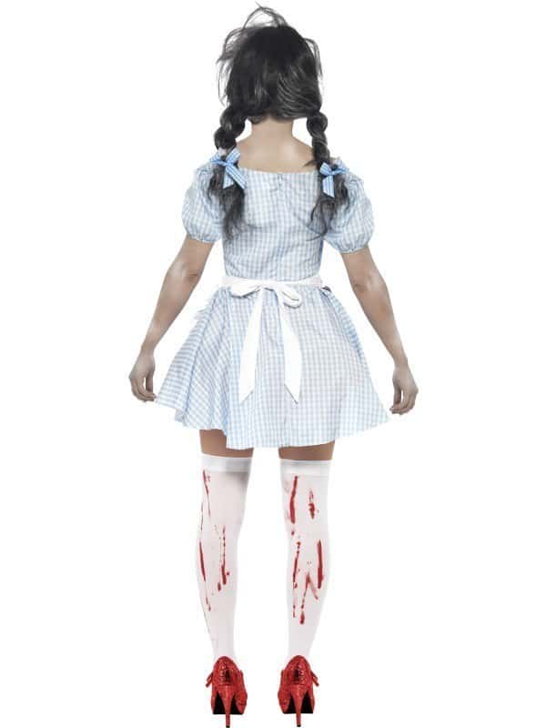 Recreate the classic 'Wizard of Oz' Dorothy look with this eery costume which features a blue and white blood stained mini dress with attached apron.
