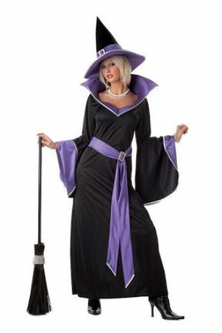 The Incantasia Glamour Witch Costume has a black dress; flowing sleeves with silver trim and purple lining; black/purple padded collar with silver trim; and purple front belt with rhinestone buckle.