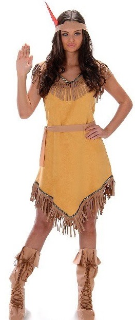 Indian Girl Costume includes a dress with fringe detail and a belt. Costume also includes a headband with feather and a pair of boot covers.