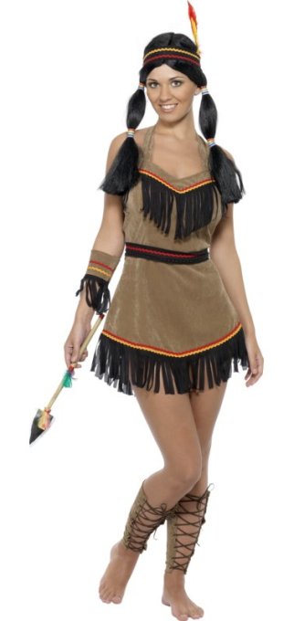 Indian Woman Costume consists of a fringe detailed Indian dress, headband with feather, matching arm band and belt and lace up leg cuffs.