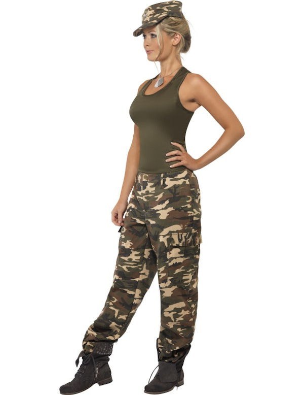 Be part of the military with our Khaki Camo costume. This female Khaki Camo costume includes a light weight vest in khaki green and camouflage trousers.