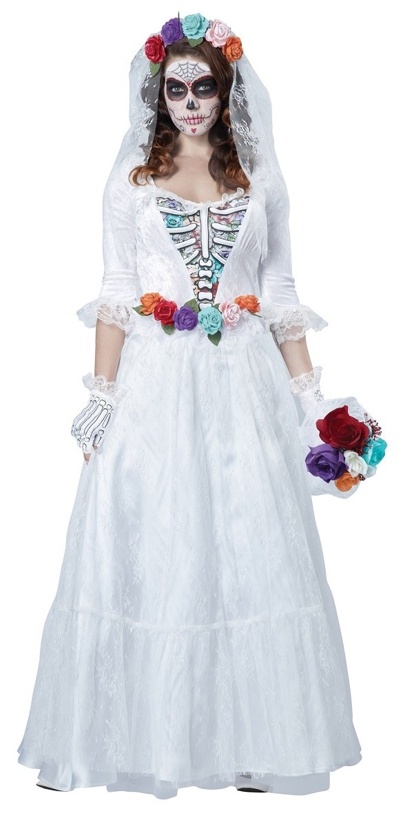Costume includes a long white lace wedding dress with a printed skeleton bones and flower chest piece and pair of skeleton gloves with a lace trim. The dress also features a pettiskirt.