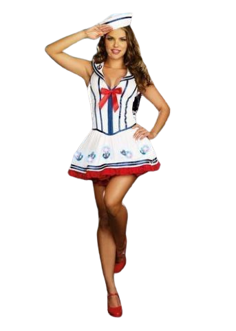 Ahoy Sailor... Sail the 7 seas in style with this excellent costume.Anchor Management is designed as a white dress with blue stripes with large red ribbon.