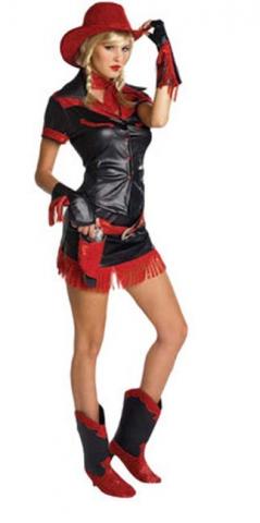 The look is completed with red cowgirl hat, red and black glovelets, red belt with holster and black and red boot toppers.