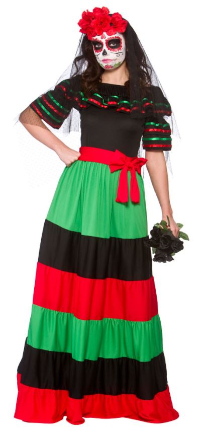 Day of the Dead Senorita costume includes black, red and green dress with frilled nackline, short sleeves and striped skirt with red belt.
