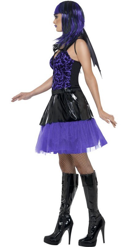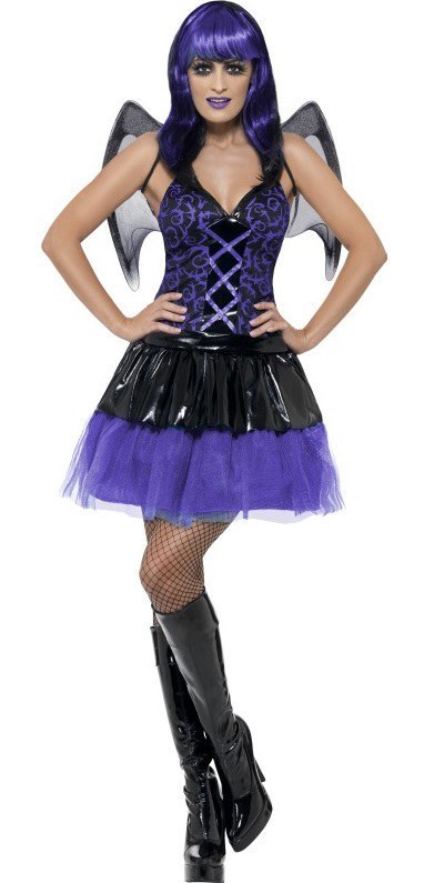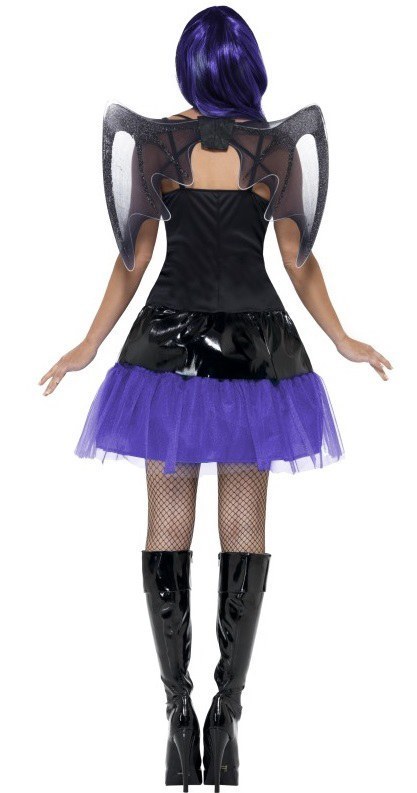 Demoness costume includes a black and purple dress with tut style skirt and a pair of wings.