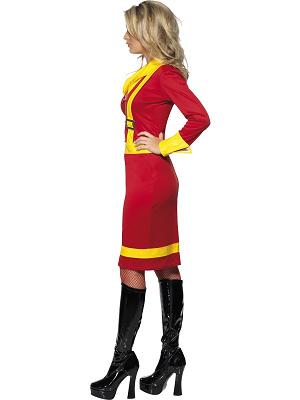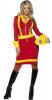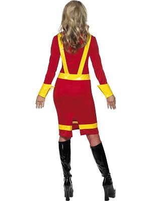 Ladies Fire Fighter costume is a bright red and yellow pencil shape dress with zip to the front, yellow collar and cuffs and attached buckled braces.