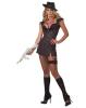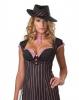 Ladies Gangster Moll costume includes a short black and white pin striped dress with sweetheart neckline and pink trim with button detailing. Also included is a matching gangster hat and a pink neck tie.