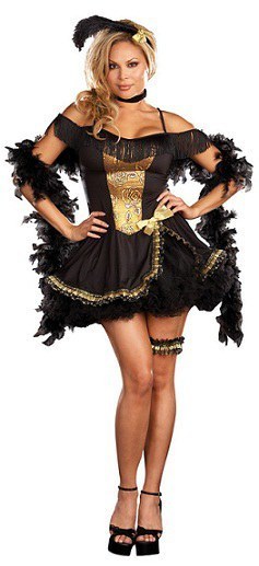 The costume comes complete with stretch knit dress with an off the shoulder detail, black & gold feather headpiece, black & gold garter, black neckband and the look is completed with black feather boa.