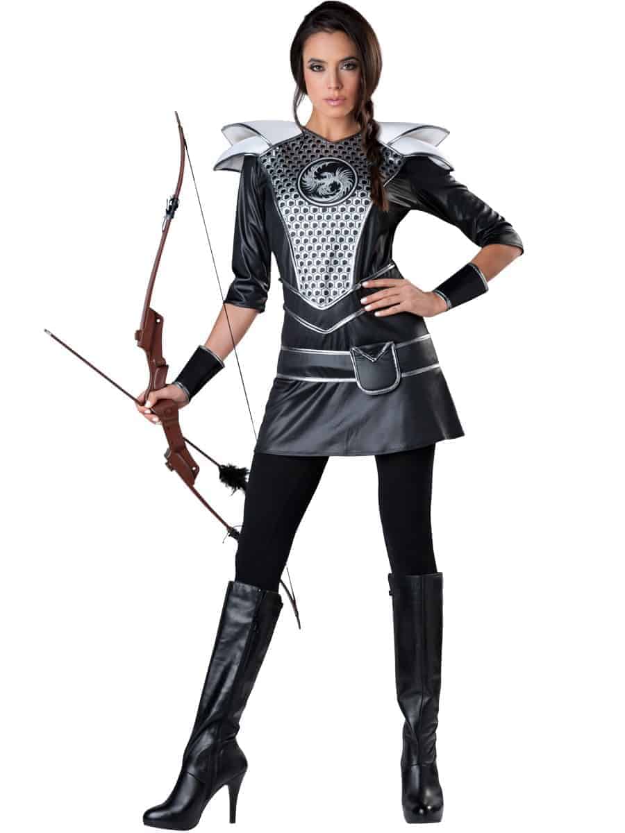 Midnight Huntress costumes includes a black and silver dress with layered epaulettes, lame trim and a silver crest. A belt with satchel and wrist cuffs are also included.
