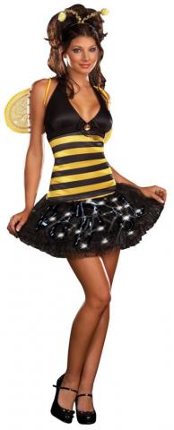 Miss Bee-Dee-Light-Full Costume includes a shiny yellow and black halterneck dress with attached layered petticoat skirt with unique fiber optic lights and hidden pocket for on/off switch.
