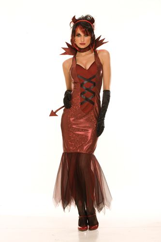 Ladies Mistress Inferno costume includes a red and black shimmer halterneck dress with mesh detailing on the skirt and faux corset detailing with black ribbon on the bodice. The dress also features a high collar and devil tail. To complete the look a headband with horns and matching choker are also included.