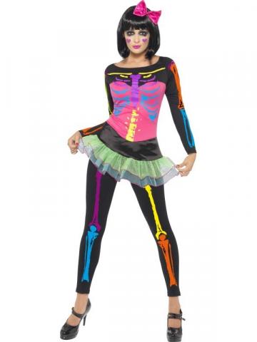 Ladies Neon Skeleton costume includes a black long sleeved top with neon bone print and an attached tutu. Also included is a pair of co ordinating leggings.