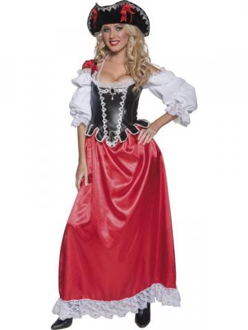 Our Ladies Pirate Wench Costume includes a a long dress with a red bottom and lace fringing at the hemline and a white off-shoulder shirt attached to a black tight-fitting corset.