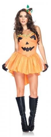 Ladies Pumpkin Princess costume consists of a glitter tulle petticoat mini dress with clear straps and pumpkin glitter face detail on the bodice and black bow detail on the back. To complete the look a matching orange and green pumpkin fascinator is also included.