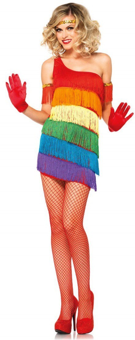 Complete with multi-coloured tiered fringe, asymmetrical dress with gold sequin armbands and matching headband.
