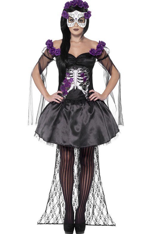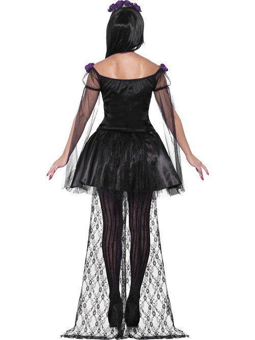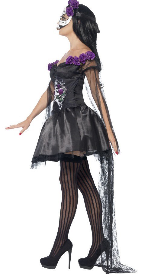 Senorita Costume includes a crop top with printed front and mesh sleeves and a skirt with attached underskirt. Also included is a headband with roses.