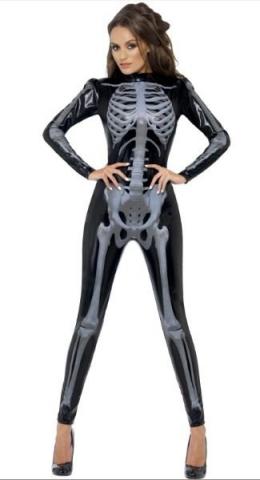 This Ladies Skeleton is a black bone print catsuit with capped sleeves.