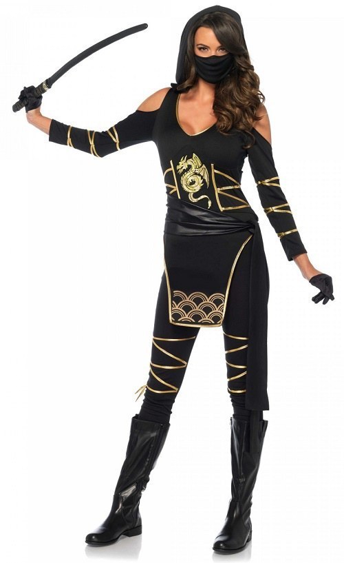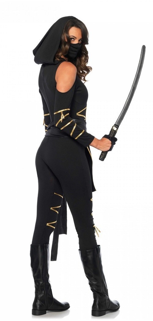 Stealth Ninja Costume includes black hooded catsuit with shoulder cutouts and gold dragon accents. The catsuit also features gold wrap around ties and a waist sash.
