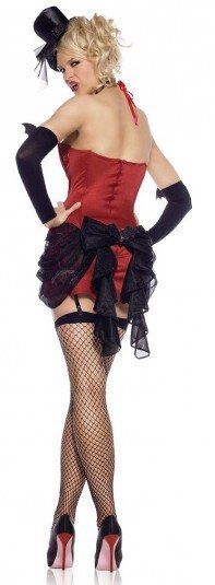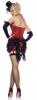 The Ladies Vampire Costume features a burlesque style red and black lace up corset with black ribbon trim and short garter skirt with black tulle bustle overskirt and back bow. To complete the vampish look a red and black neck piece with bat appliqué and matching mini top hat are also included.