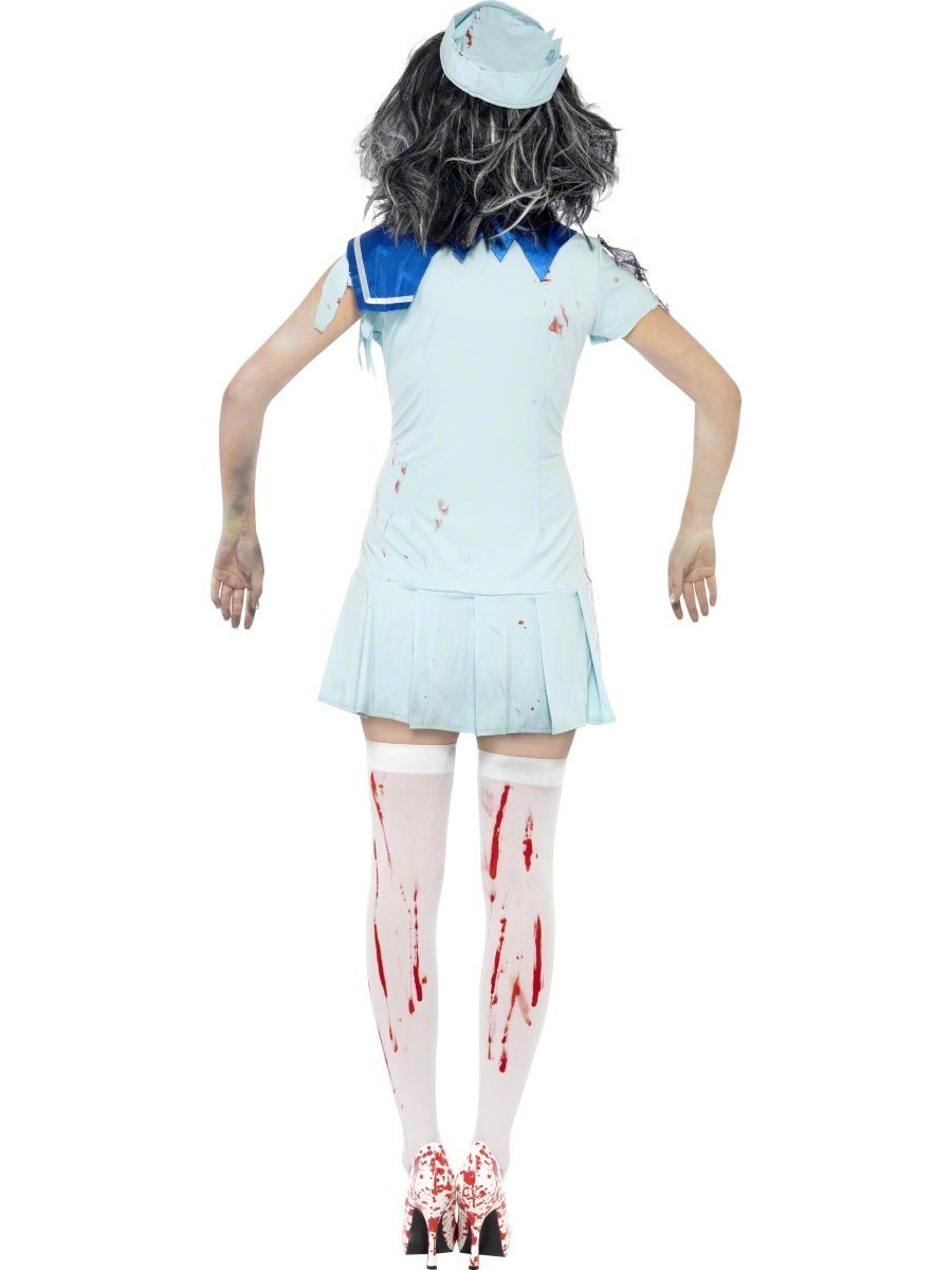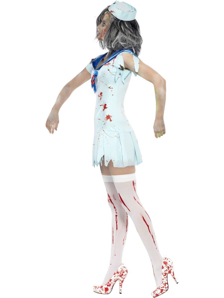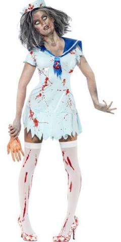 The Zombie Sailor Costume is a short white dress with jagged edging, a blue sailor necktie with red anchor motif and blood stains. To complete the undead sailor look is a matching blood stained sailor hat with anchor motif