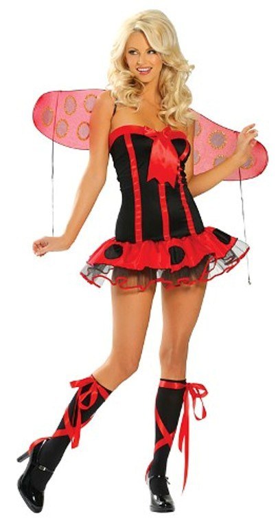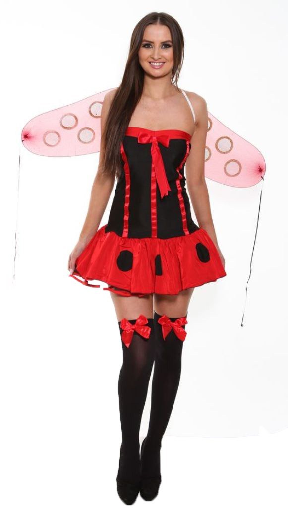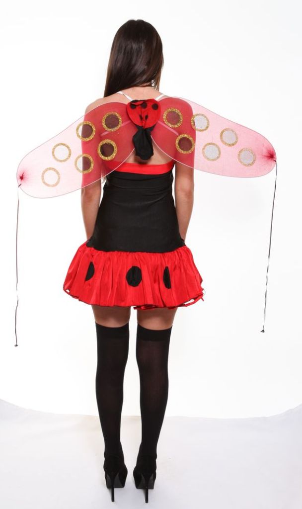 2 piece Lady Bug Costume features a red and black strapless tutu dress with built in petticoat also included is the red ribbon and black spot detailing on the skirt. To complete the look a pair of black and red mesh wings with ribbon tied bells are also included.