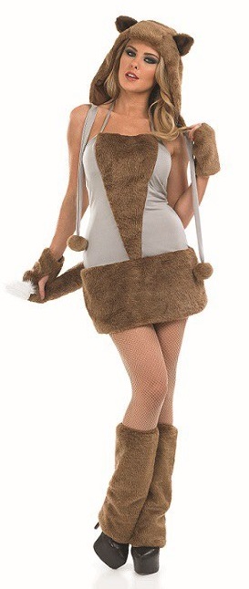 The full costume consists of brown and grey dress with attached fox tail, matching brown gloves, brown fox ear hat and brown boot covers.