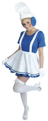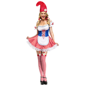 Our Lady Gnome costume is based on the iconic cartoon character from the 1980's. This mythical costume includes a white skirt with attached underskirt with blue trim and braces.