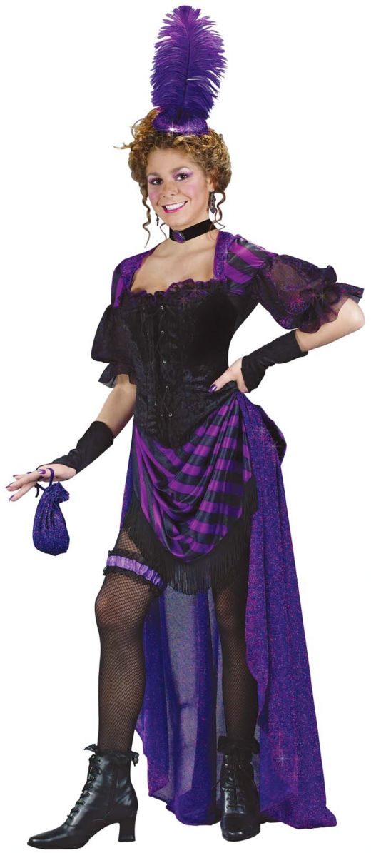 This 8 piece deluxe costume includes purple styled dress with gathered skirt and sheer sleeves with attached bustle back bow, lace-up corset, leg garter, choker, glovelettes, plus hat and feather plume.