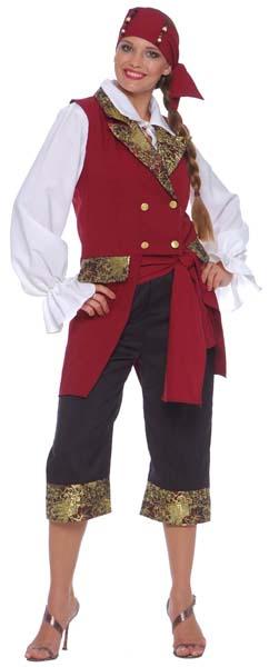 The Lady Pirate costume includes white shirt with flared cuffs, three quarter length, elasticated waist black trousers and a wine waist coat with tails and gold embroidered collar and pocket covers.