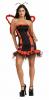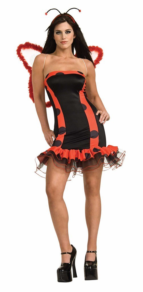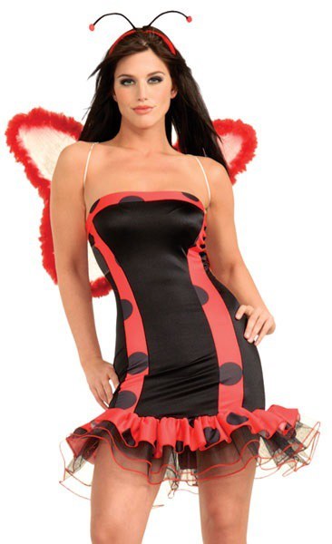 The Ladybird Costume includes: Black boob tube style dress with ladybird design outline and ruffled hem with mesh underlay, wings and headband with antennae.