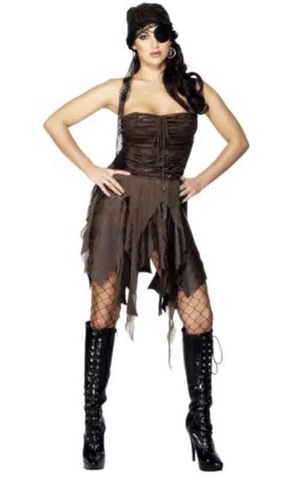 Leather Pirate Lady Costume includes a leather look strapless dress with corset tie effect at the front. The skirt has slashed effect along the hem.
