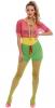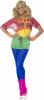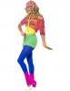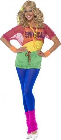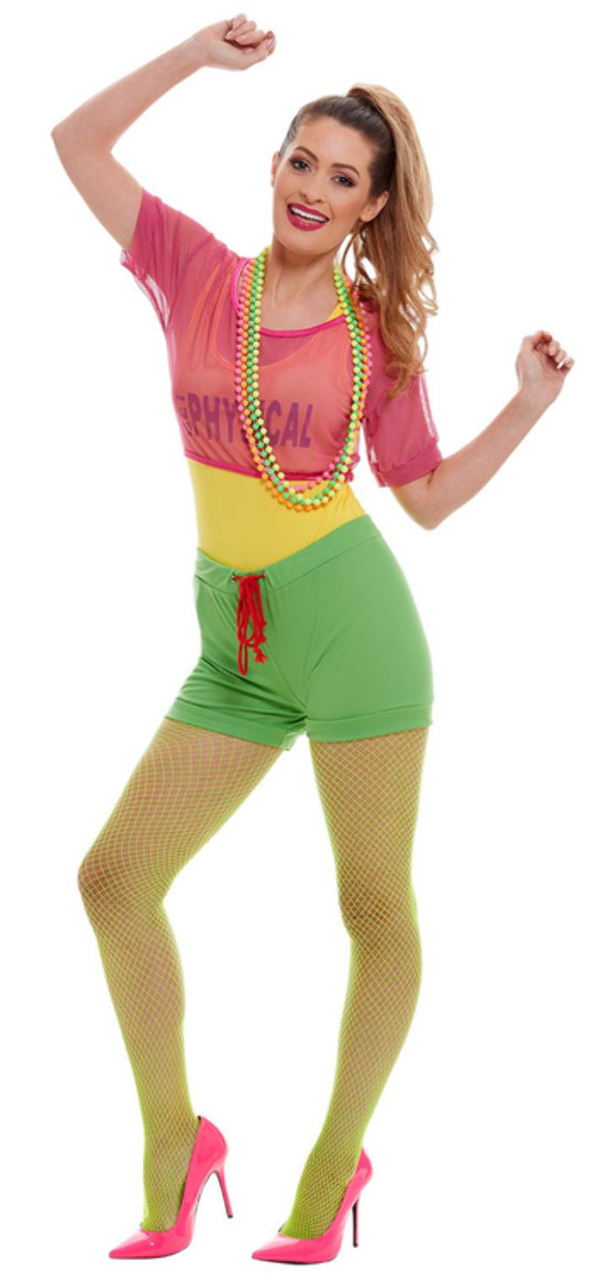 The Let's Get Physical 80's Girl set includes a yellow leotard with 'GET PHYSICAL' printed on the front, a pink crop top, a pair of green shorts and a multi - coloured headband.