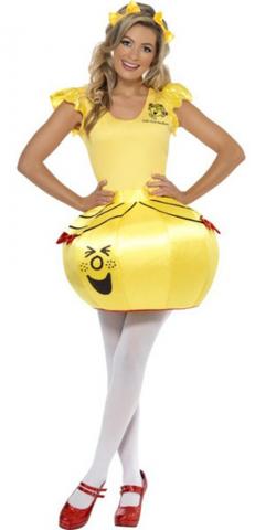 The Little Miss Sunshine Costume is bright and cute with a fitted yellow top and a tulip style yellow skirt with a black smiley printed on. Also included is a neat yellow headband to symbolise the rays of the sun.