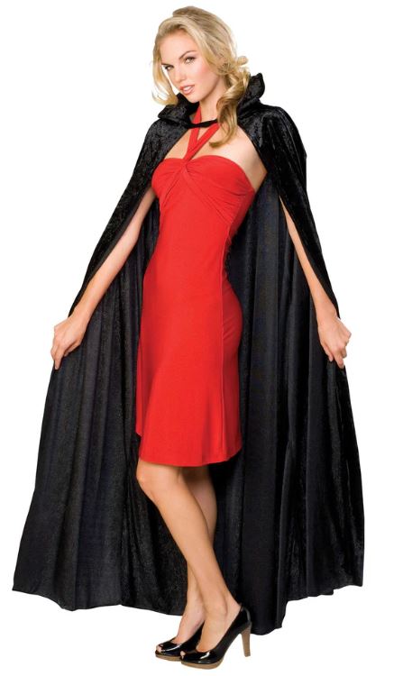 The Long Crushed Velvet Cape in black is a timeless costume essential.
