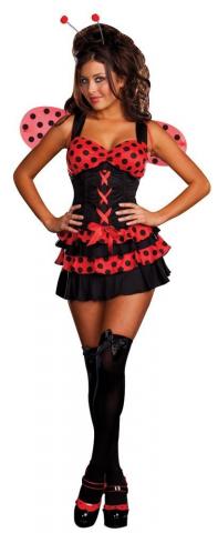 The Lovely Lady Bug costume features a short, black and red spotted ruffle hem dress with black corset style bodice with red ribbons and black straps.