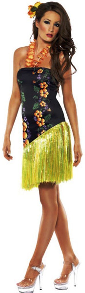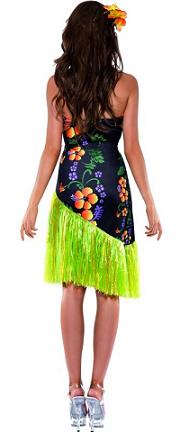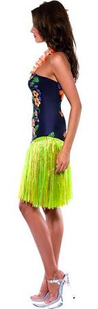 Luscious Luau Costume is a pretty Hawaiian themed dress, with floral print on the top which meets the multicoloured straw skirt at an angle.