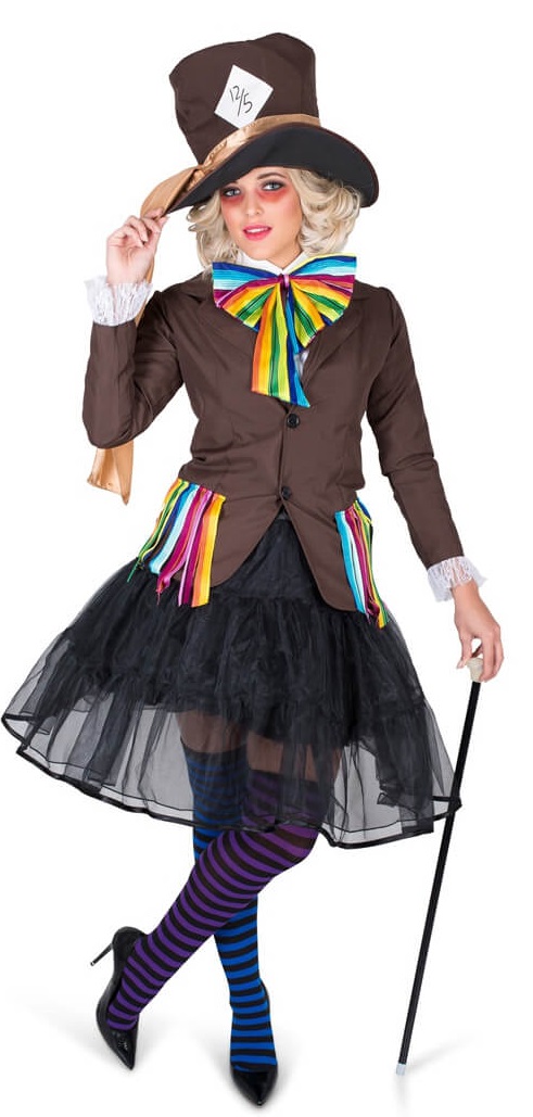 Mad Hatter Girl Costume a twist on the classic this stylish piece will drive all your friends mad. Includes a classical jacket with colorful attached ribbons and a knee length skirt.