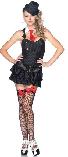 Two piece Mafia Princess Costume consists of black pinstripe halter ruffle dress with corset style top with gold buttons and faux leather belt. The costume also features a white collar and red tie with dollar sign in centre.