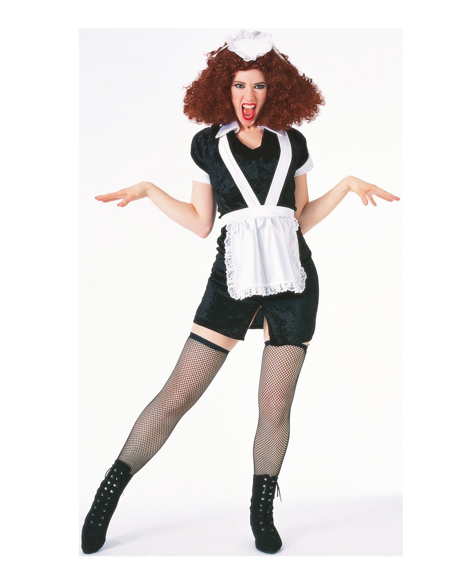 Magenta Costume consists of one black velvet feel dress with attached pinafore and collar. Dress is hem finished and includes elasticated waistband for comfortable fitting. Includes headpiece.