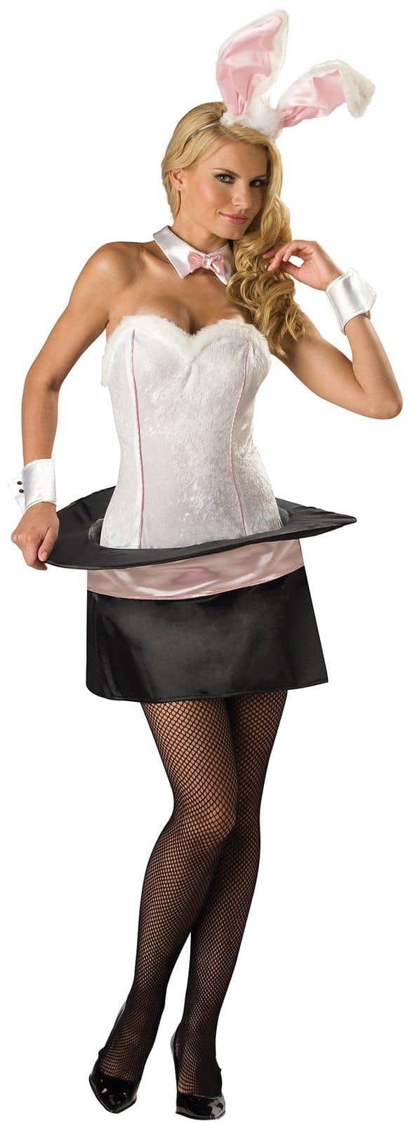Magic Bunny Costume includes a pink bodysuit with top hat skirt, pink bunny ear headpiece, cuffs and tuxedo bow-tie choker.